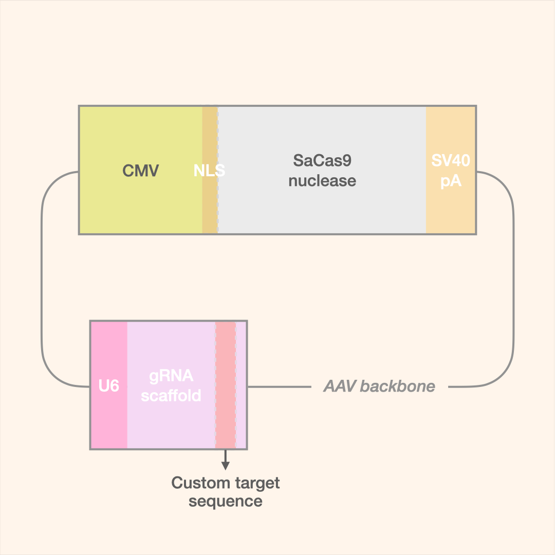 Single-vector CRISPR system for in vivo gene editing. SaCas9 delivers complete editing machinery in one AAV, eliminating dual-vector requirements. Established performance across CNS, liver, muscle, and other AAV-accessible tissues. Wild-type Staphylococcus aureus Cas9 (1053aa) with KKH-enhanced PAM recognition (NNGRRT). Industry-standard nuclease with validated efficiency across diverse cell types and applications1,2.